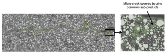 All of the zinc is activated through the lifetime of the coating. This stops steel corrosion more effectively and reduces creep corrosion if the coating suffers mechanical damage.