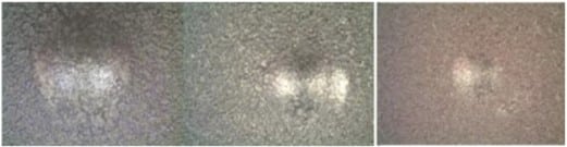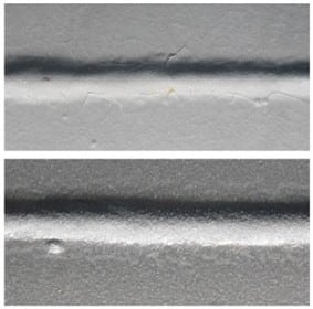 The glass spheres in the coating absorb the impact of the initial crack and stop it from propagating. (The picture on the right shows an enlargement of the crack seen on the left.)