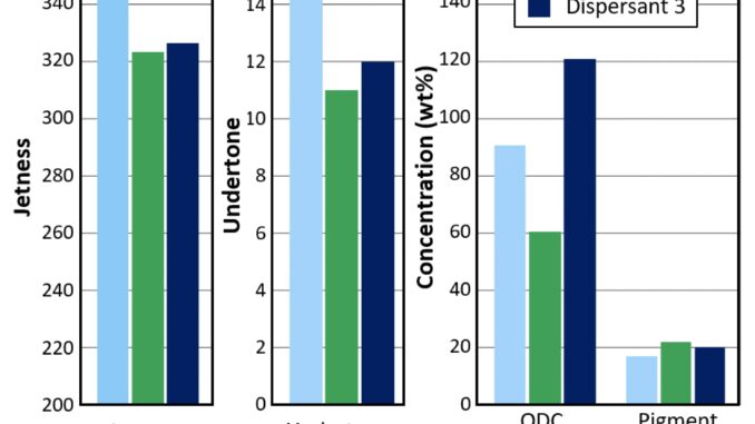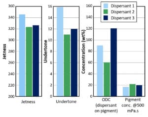 Investigations found that Dispersant 1 had the highest jetness, reaching a very high maximum value in three hours. Dispersants 2 and 3 had lower jetness values, with Dispersant 3 having the slightly better colour performance of the two. All three dispersants had desirable positive (blue) undertone values, with Dispersant 1 again having the best performance.
