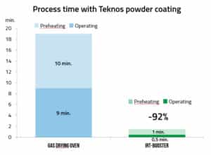 Teknos powder increased the energy efficiency of the process by up to 50%. “During testing, it emerged that the process times of conventional low-temperature powders available on the market were three minutes or more,” explains Jörg Andres, Regional Sales Manager for Industrial Curing at Hedson Technologies. “With the Teknos powder, however, the paint on the same work piece had fully hardened in 90 seconds. As a consequence, Teknos powder increased the energy efficiency of the process by up to 50 per cent. The gelling and stopping zone was also significantly shorter, which means lower investment costs.”