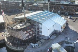 One of the world’s best-loved ships and a national treasure, HMS Victory has reached a hugely significant conservation milestone in the 10-year-long project to ensure she is protected for the next half century. The ship has been partially enclosed by temporary scaffolding.