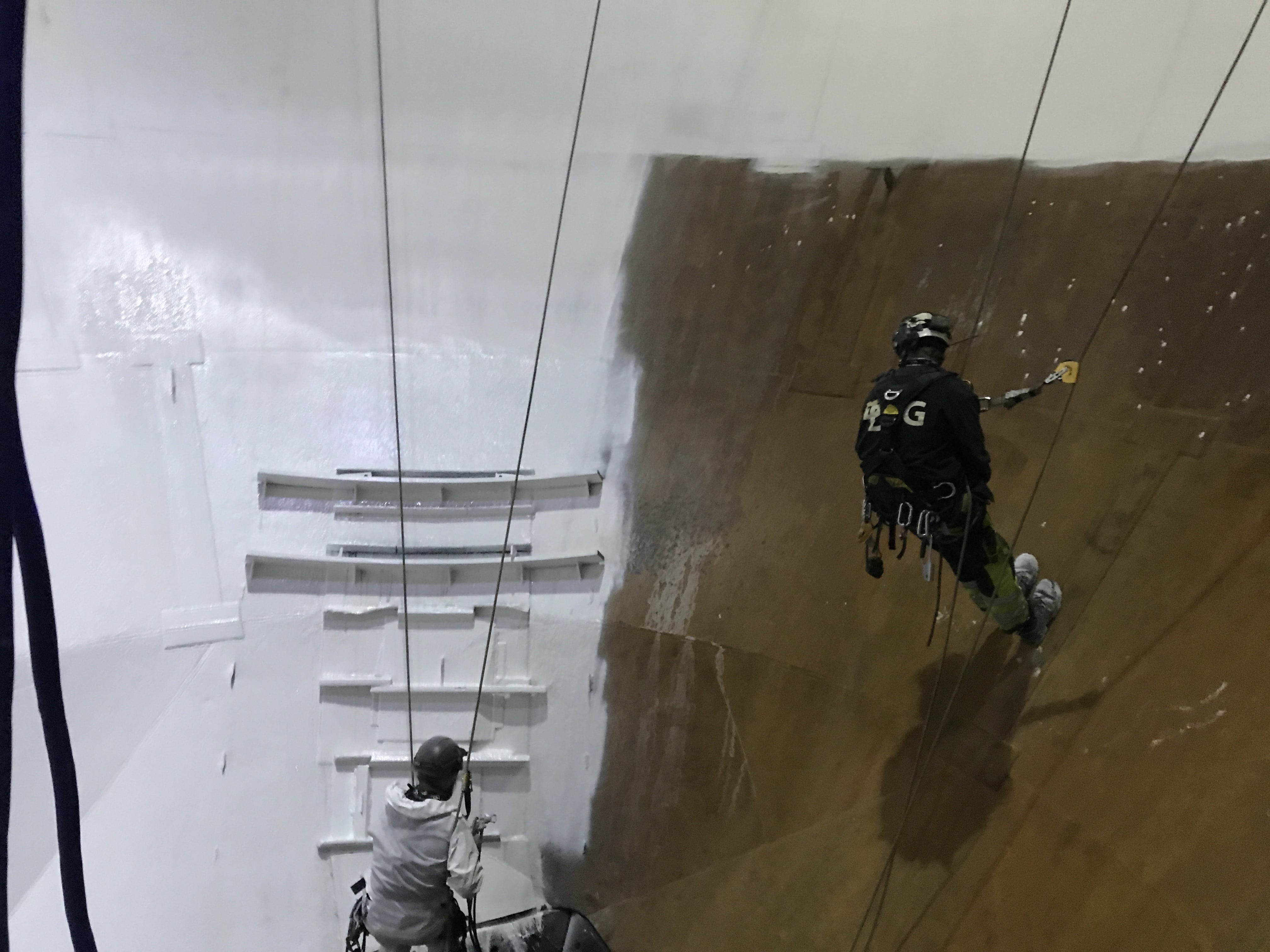To protect the steel hopper from corrosion, before applying the CBPC coating, many years of iron ore deposits first had to be removed using mechanical hand tools, as some deposits were a few inches thick in places. This work had to be done far above ground, hanging from ropes, adding complexity to the project.