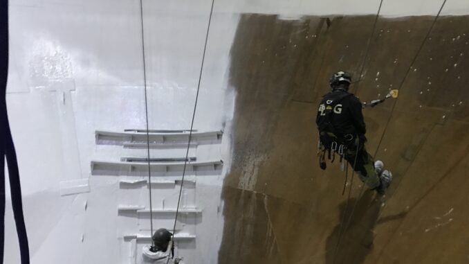 When the tank had dried sufficiently, EonCoat, winner of the NACE 2015 Corrosion Innovation of the Year Award in the coatings and linings corrosion control category, was applied directly to the steel surface without any further surface preparation.